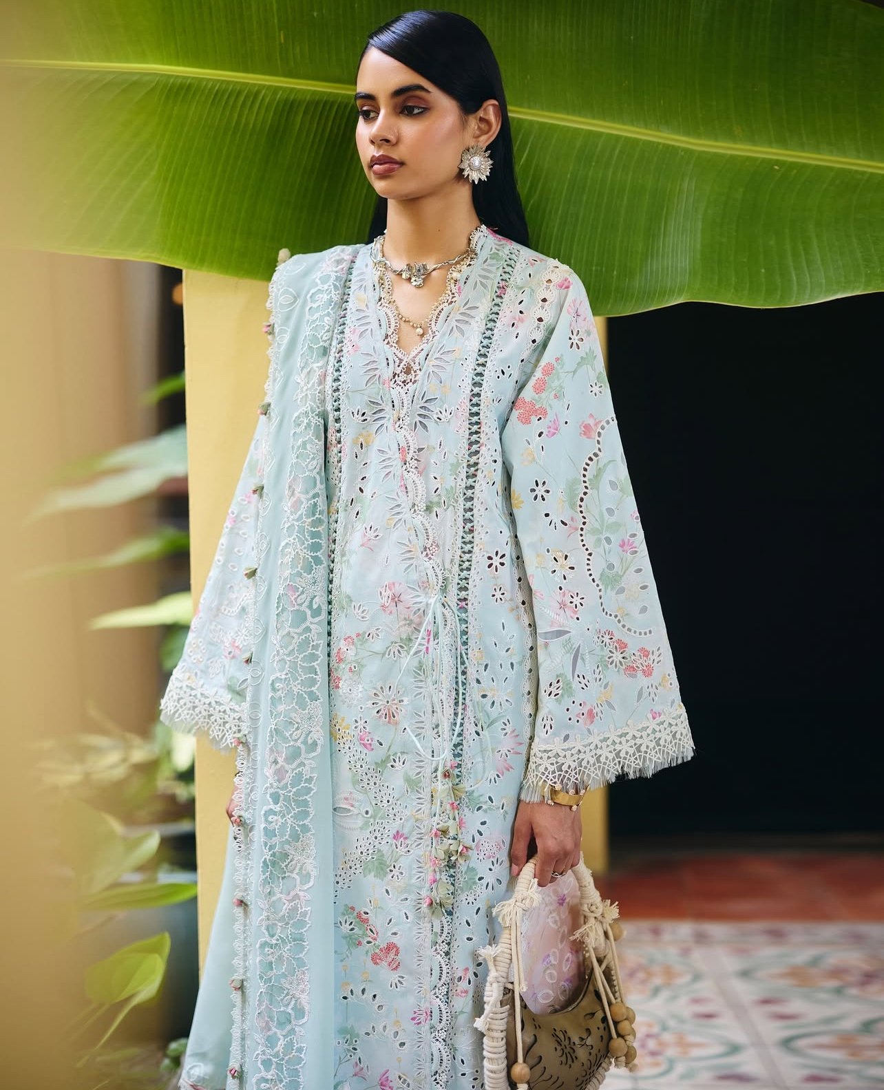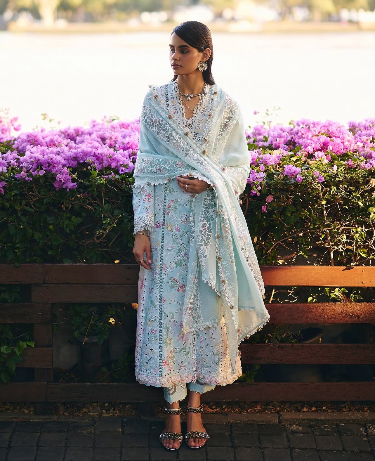 Celebrate renewal and the spirit of Eid with this 3-piece Aqua look, a study in variance. The printed lawn anghrakha style kurta, detailed with complementary colours and exquisite boring embroidery, pairs beautifully with appliqued lawn straight pants and a chiffon dupatta finished with an embroidered border and tassels.