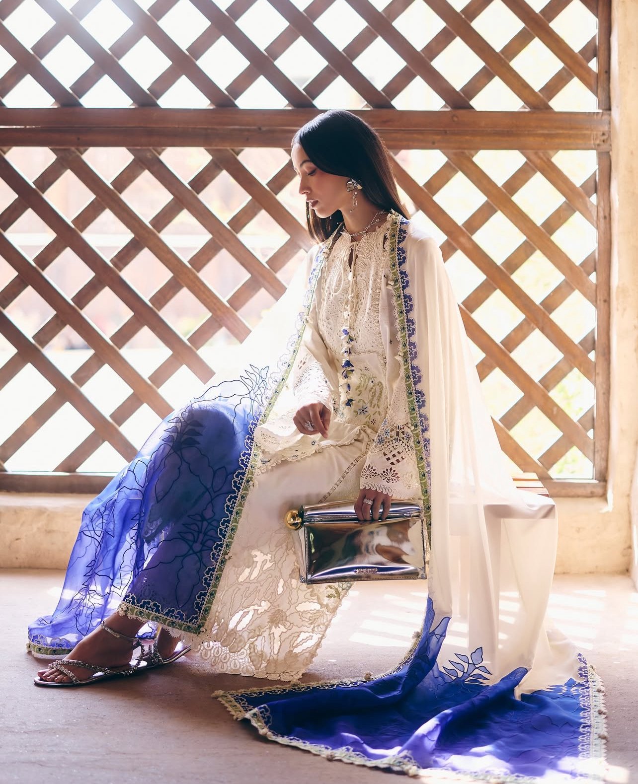 Embrace spring–summer in this 3-piece Ivory ensemble, perfect for Eid. The pure lawn Jacquard shirt features a cutout neckline, keyhole collar, enhanced with green-blue embroidery and cutwork. Paired with embroidered Cotton culottes, and a Chiffon dupatta with a green border, ombré blue floral waves, and tassels for a festive finish.