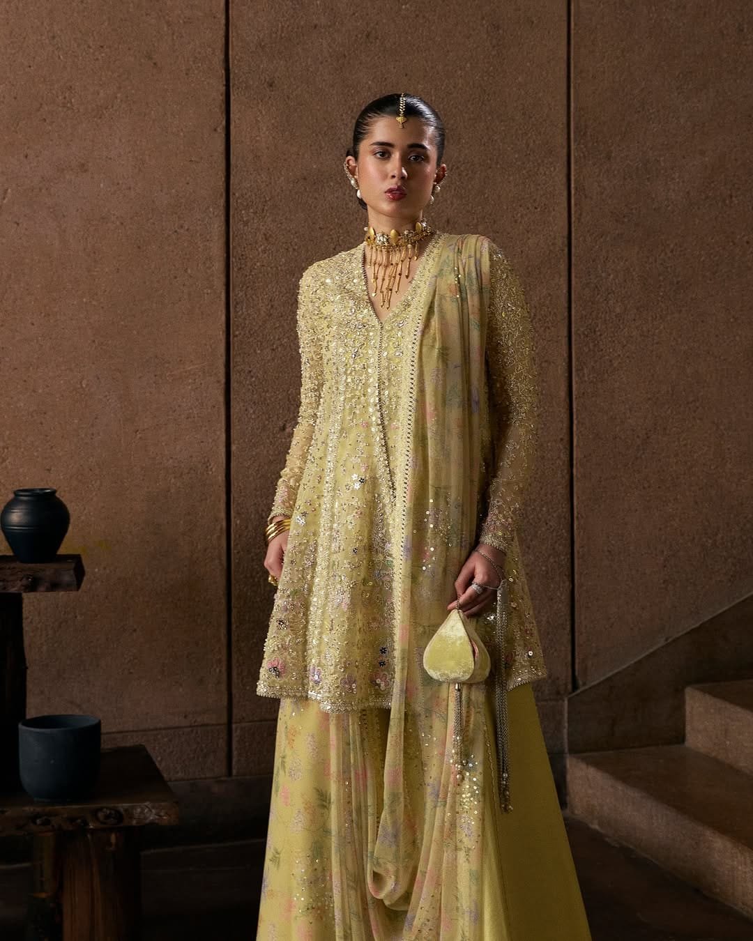 In radiant butter yellow, this four-piece design channels festive elegance. The embroidered organza peplum with a V-neckline and fitted sleeves is highlighted with lilac, rose gold, and mint accents. Paired with raw silk sharara pants styled in a sari-inspired chiffon drape adorned with sequins, prints, and lace, the ensemble is graceful and refined. ( can be ordered as shown with fixed saree drape or with a regular duppatta )