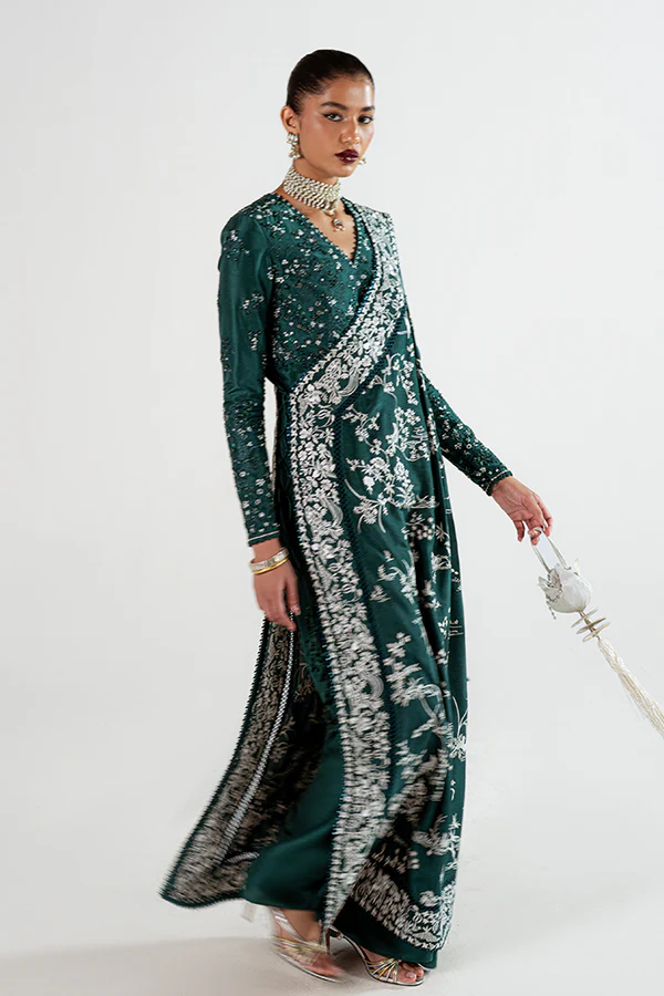 - Silk drape with white shikargah embroidery, bordered edges, and tassel ties