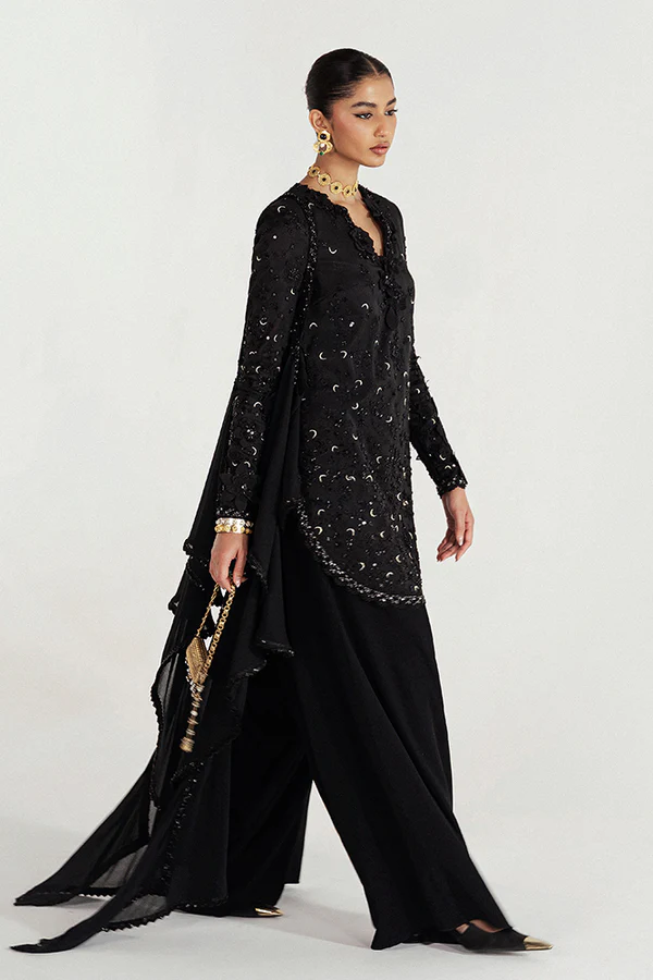 - Silk short shirt with scalloped neckline, gold crescents, and 3D floral detailing