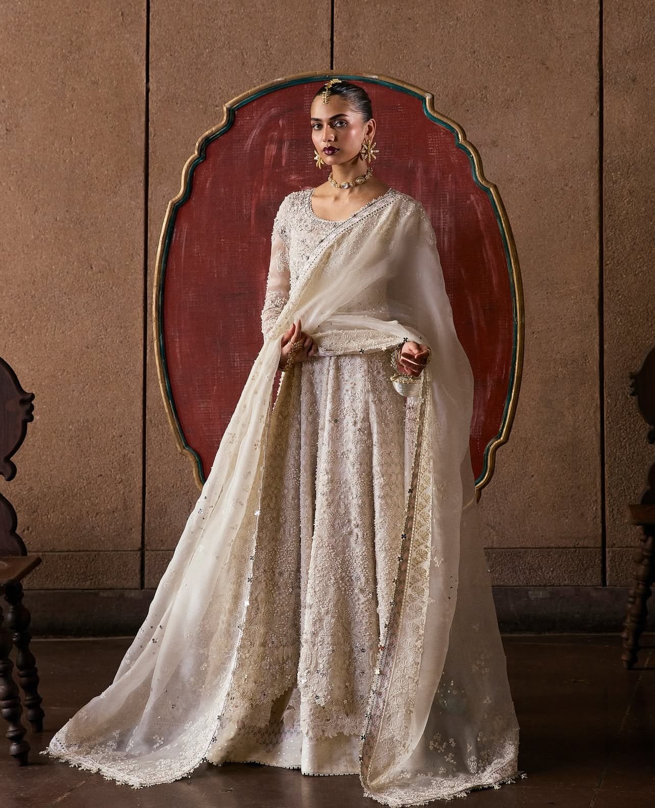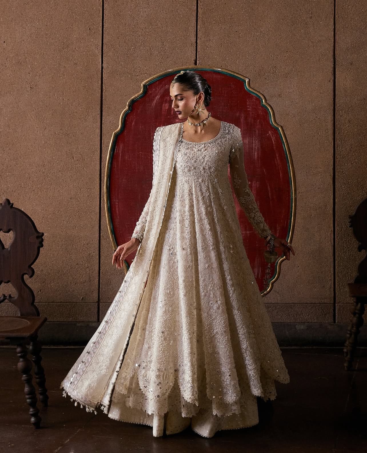 A vision in white, this four-piece organza pishwaas embodies timeless elegance. Featuring a scoop neckline, layered cap sleeves, and delicate self-embroidery with beads, mirrors, and pearls, it is layered over a printed slip with cutwork detailing. Paired with floral grip silk printed sharara pants and a matching organza dupatta finished with borders, sequins, pearls, and mirror tassels, the ensemble exudes ethereal charm.
